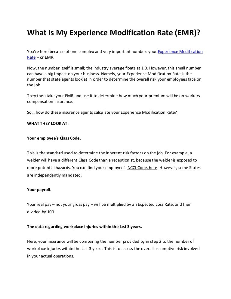 It is a numeric representation of a business's claims history and safety record as compared to other businesses in the same industry, within the same state. You can verify that the emr, emod or xmod used on your policy is accurate through a experience modification rate review. So, it pays to understand exactly how your experience modification rate is calculated, and how that affects your premium. Insurance companies use the experience modification rate (emr) to establish future risk and set your company's premiums. The lower the emr of your business, the lower your worker compensation insurance premiums will be. If your emr rate is higher than the average, you will pay more for worker's compensation coverage. The experience modification rate (emr) is a tool used by the u.s. Osha's dart rate, which is an acronym for days away or restricted time, is a measure of accident severity. The rating reflects a variety lagging indicators, such as injury costs or claim history, and offers a prediction of future risk. What is experience modification factor? Approximately 90 percent of workers' compensation premium dollars come from experience rated policies. Emr is a number used by insurance companies to measure both past costs of injuries and future chances of risk. An employers' experience modification rate refers the factor calculated from actual loss experience amd used to adjust an the businesses manual premiums (higher or lower) based on the businesses loss experience relative to the average underlying manual premiums.